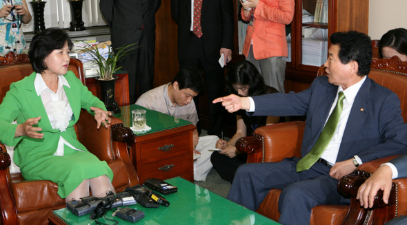 안상수 한나라당 원내대표가 6월30일 추미애 국회 환경노동위원장을 찾아가 비정규직 보호법 시행을 3년 유예하는 한나라당 개정안을 상정해달라고 요구하고 있다. 추 위원장이 이 요구를 거부하자 안 원내대표는 크게 화를 내며 자리를 박차고 일어섰고, 다음날 한나라당 소속 환노위 간사인 조원진 의원은 유예안의 기습 상정을 시도했다. 사진 한겨레 김봉규 기자