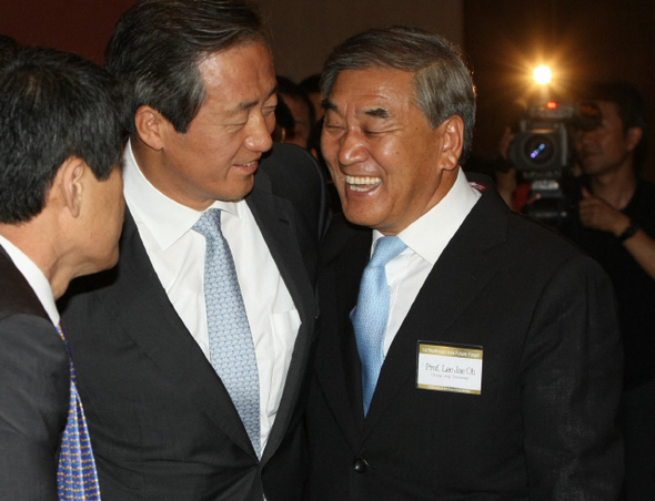 이재오 전 한나라당 최고위원이 7월13일 오전 서울 동작구 흑석동 중앙대에서 열린 동북아 미래포럼 국제학술대회에서 정몽준 최고위원과 이야기를 하고 있다. 사진 한겨레 박종식 기자