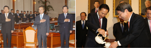 국무총리의 권한과 위상, 정치적 미래는 대통령이 총리의 역할을 얼마나 인정해주느냐에 달려 있다. ‘실세총리’라는 별명을 얻었던 이해찬 전 총리(왼쪽 사진 가운데)와 대선주자군으로 분류되는 정운찬 총리(오른쪽 사진 오른쪽)가 각각 국무회의에 참석한 모습. 사진 왼쪽부터 청와대사진기자단·한겨레 김종수 기자