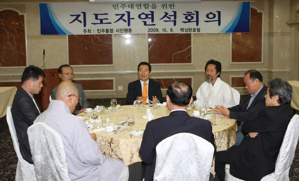 민주통합시민행동 주최로 10월8일 오전 서울 여의도의 한 호텔에서 열린 ‘민주대연합을 위한 지도자 연석회의’에서 민주당 정세균 대표와 민노당 강기갑 대표, 이해찬 시민주권모임 대표 등 참석자들이 인사말을 나누고 있다. 사진 한겨레 김봉규 기자