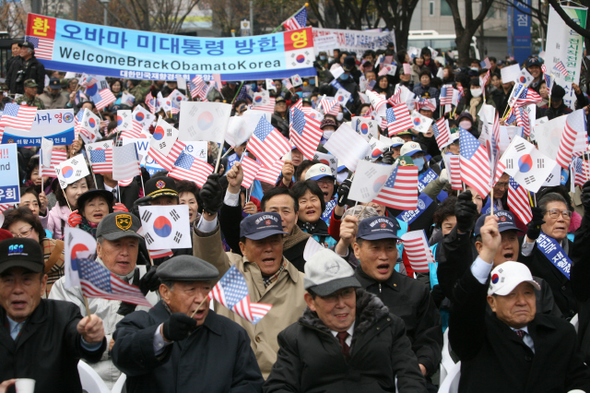 애국을 남의 일로, ‘애국단체’를 ‘외국단체’쯤으로 여기는 것 아니냐는 비판도 있을 수 있다. 이런 비판은 억울하다. 이래 봬도 나도 세금 내는 남자다. 매달 꼬박꼬박 건강보험료 잊지 않고 내고 있다. 때 되면 주민세도 챙긴다. 군대, 물론 다녀왔다. ‘애국’이라면 누구에게도 뒤지지 않는 사람으로서 애국 어르신들께 애국하지 말라는 이야기를 하고 싶은 것은 아니다. 애국 충분히 하시되, 제대로 하라고 말씀드리고 싶은 거다. 이를테면 이런 사소한 실수가 상대방에게 상처를 줄 수 있다. 애국 어르신들이 내건 현수막 가운데 ‘WelcomeBrackObamatoKorea’라고 쓰인 것도 있었다(사진 참조). 띄어쓰기를 하지 않은 이유는 현수막 인쇄비용 때문이라고 이해할 수 있겠다. 하지만 ‘브락오바마’는 어쩔 것인가. 버락 오바마 대통령의 숨겨진 동생이라도 방한했다는 말인가. 아니면 설마 오바마가 흑인(Brack→Black?)이란 사실을 강조하고 싶었던 것인가. 사실 사람 이름은 민감한 부분이어서 어르신들의 실수는 치명적일 수 있다. 거꾸로 생각해보자. 이명박 대통령이 미국에 가서 ‘환영 이멍박’ ‘환영ㅇ명박’이라 적힌 현수막을 발견한다면 당사자 기분이 어떻겠는가. 애국 어르신들의 뜨거운 환영에도 불구하고 오바마 대통령이 이들 앞을 바람처럼 냉랭하게 지나쳐버린 이유는 바로 여기에 있었다.