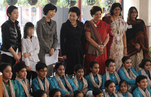 이명박 대통령과 함께 인도를 방문한 부인 김윤옥(가운데)씨가 25일 오전(현지시각) 뉴델리 산스크리티 학교를 방문해 큰딸 이주연(맨 왼쪽)씨, 외손녀(왼쪽 둘째) 등과 함께 학교를 둘러본 뒤 인도 학생들과 기념사진을 찍고 있다. (손녀딸은 미성년임을 고려해 모자이크 처리했다.) 뉴델리/청와대사진기자단