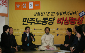 오병윤 민주노동당 사무총장(왼쪽)이 9일 오전 서울 영등포구 문래동 당사에서 지지차 비상농성장을 찾은 김근태 전 민주당 최고위원 등 민주당 관계자와 이야기를 나누고 있다. 한겨레 이종근 기자