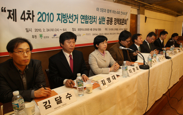 2010연대와 민주통합, 시민주권, 희망과대안 등 4개 시민사회단체와 야 5당이 참여한 지방선거 정책토론회가 2월24일 서울 중구 정동 프란치스코회관에서 열렸다. 이날 토론회에서는 지방공동정부 구성에 관한 다양한 아이디어가 제시됐다. 한겨레 김종수 기자