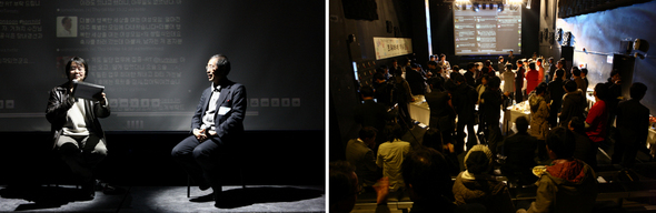 3월4일 저녁 7시 서울 홍익대 앞 한 공연장에서 열린 트윗보터 파티. 박원순 변호사(왼쪽 사진 오른쪽)는 “선관위나 국정원이 감시를 하면 트위터의 물이 흐려진다”고 말했다. 트위터를 통한 공지 몇 번만으로 뜻을 같이하는 사람 150여 명이 모였다. 트위터는 세상을 하나의 끈으로 연결하고 있다.
