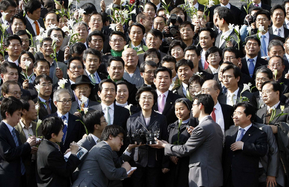 곽영욱 전 대한통운 사장에게 5만달러를 받은 혐의로 기소된 한명숙 전 국무총리가 4월9일 무죄가 선고된 뒤 소감을 밝히고 있다. 6월2일 서울시장 선거에 나설 예정인 한 전 총리의 정치 행보가 한결 가벼워질 것으로 보인다. 한겨레 박종식 기자