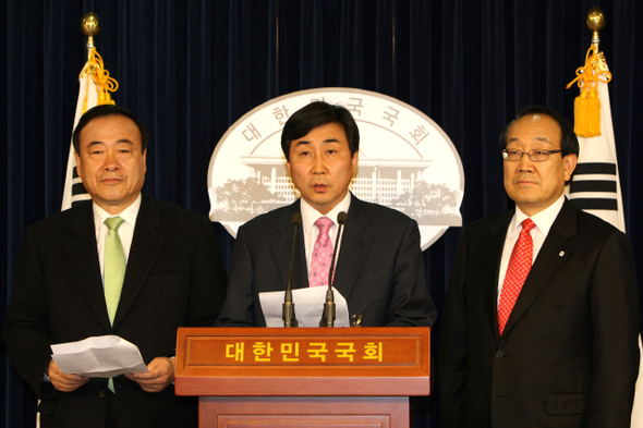 광역단체장 후보 경선 방식 등을 둘러싸고 민주당의 내홍이 심해지고 있다. 4월7일 국회 정론관에서 유필우·이종걸·이계안(왼쪽부터) 등 민주당 지방선거 예비후보들이 기자회견을 열어 공정경선 보장을 요구했다. 한겨레 김봉규 기자