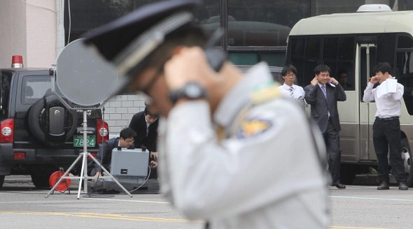 경찰이 새로 도입한 진압장비 ‘지향성음향장비’(음향 대포)를 1일 오후 서울 동대문 제1기동단 운동장에서 시연회를 열어 언론에 공개했다. 50m 떨어진 곳에 있던 경찰이 귀를 막고 있다. 한겨레 이종찬 선임기자 rhee@hani.co.kr