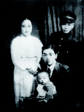 어머니 김례정님의 젊은 시절 사진. 앉아 있는 이가 아버지 우제화, 학생은 삼촌 우제순이고 아이가 큰아들 우영식이다.