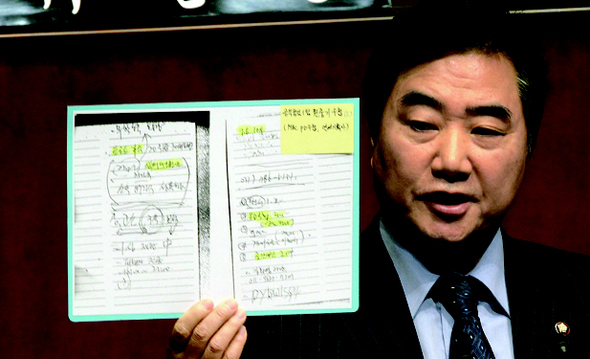 이석현 민주당 의원이 11월17일 국회 예산결산위원회에서, 김종익 전 KB한마음 대표를 불법사찰한 전 국무총리실 공직윤리지원관실 직원의 수첩 메모 복사본을 보여주고 있다.한겨레 김경호