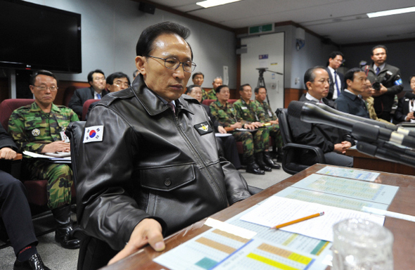 안보 이슈가 터질 때마다 이명박 대통령 지지율은 떨어진다. 연평도 피격 사건 당일인 11월23일 저녁 이 대통령이 서울 용산 합동참모본부 지휘통제실에서 현황 보고를 받고 있다.청와대사진기자단
