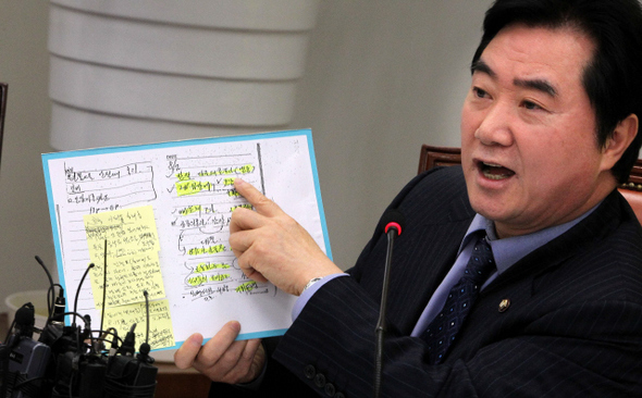 이석현 민주당 의원이 12월7일 민주당 원내대책회의에서 ‘박영준 지식경제부 차관이 청와대에 근무할 때 부하직원인 이창화 전 행정관이 박근혜 전 한나라당 대표를 사찰했다’는 의혹을 추가로 제기했다. 이 의원이 가리키고 있는 원충연 전 공직윤리지원관실 조사관의 수첩엔 이영호 전 고용노사비서관을 뜻하는 것으로 보이는 ‘2B’라는 메모가 선명하다. 한겨레 김경호