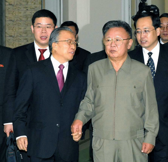 다이빙궈 중국 외교담당 국무위원이 지난 12월9일 평양에서 김정일 국방위원장과 회담하기 위해 손을 잡고 걸어가고 있다.REUTERS