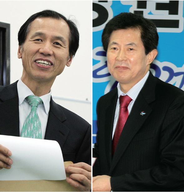 4·27 강원지사 선거에서 민주당 후보 출마를 선언한 문화방송 사장 출신의 최문순 전 민주당 의원(왼쪽)과 한나라당 후보 출마를 선언한 엄기영 전 문화방송 사장. 한겨레 김정효·연합