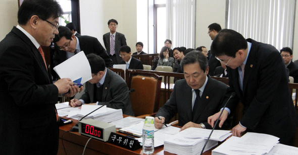국회의원에 대한 입법로비를 허용하는 내용을 담고 있는 정치자금법 개정안을 기습 처리한 뒤 여론의 질타를 받은 국회 행정안전위원회. 3월7일 맹형규 행정안전부 장관(오른쪽 두 번째)이 여야 의원들과 안건에 대해 논의하고 있다. 법인과 단체의 정치자금 기부는 10여 년의 시차를 두고 헌법재판소의 허용과 금지를 오간 쟁점이다. 한겨레 김경호