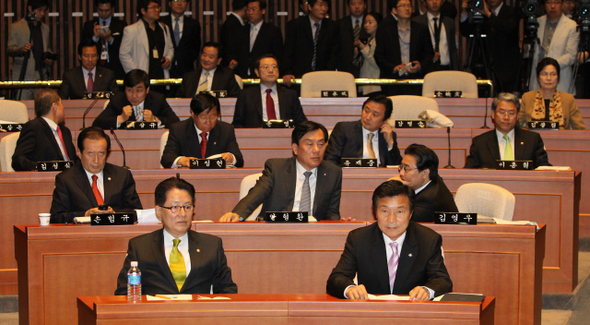 민주당은 최근 재벌 개혁에 관한 정책을 고심 중이다. 지난 5월4일 민주당 손학규 대표(앞줄 오른쪽)와 박지원 원내대표가 국회에서 열린 의원총회에 참석해 앉아 있다.