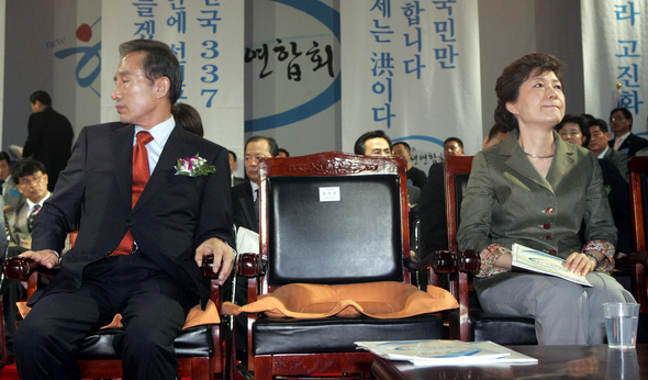 2007년 7월17일 서울 올림픽공원 역도경기장에서 열린 한나라당 전국청년연합회 출범식에 참석한 이명박·박근혜(왼쪽부터) 당시 한나라당 대선후보 경선 후보. 한겨레 김종수