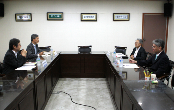 8월10일 오후 한겨레신문사 8층 회의실에서 문흥수·정미화 변호사, 임지봉·하태훈 교수(왼쪽 위부터 시계 반대 방향)가 차기 대법원장의 '자격'을 두고 대화를 나누고 있다. 사진 가운데 비어 있는 자리가 상징적으로 다가온다. 한겨레21 정용일