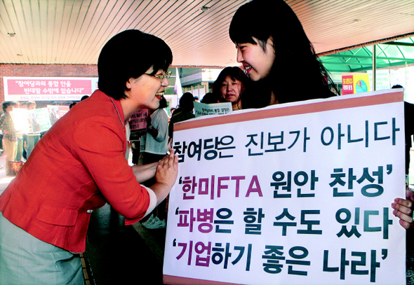 통합이냐 사분오열이냐 반면 민주노동당의 사정은 복잡하다. 진보신당이 통합 자체를 놓고 내홍을 겪고 있다면, 민주노동당은 국민참여당 때문에 당권파와 비당권파가 갈등하고 있다. 이정희 대표를 중심으로 한 당권파는 국민참여당과의 통합에 적극적이다. 지난 9월25일 민주노동당 당대회에서 표결한 ‘향후 진보대통합 추진방안’의 핵심이 ‘국민참여당이 통합 대상임을 확인한다’였던 건 이 때문이다. 하지만 격론 끝에 통합안은 부결됐다. 소속 의원 6명 가운데 이 안에 찬성한 사람은 이 대표와 김선동 의원 두 사람뿐이었다. 반대표를 던진 권영길·강기갑 의원과 천영세 전 의원 등 전직 대표 3명은 “국민참여당과 통합하면 진보의 반쪽을 버리는 것”이라고 당원들을 설득했다. 국민참여당과의 통합안이 부결된 뒤 이정희 대표는 사퇴 뜻을 내비쳤지만, 당권파들이 만류했던 것으로 알려졌다. 비당권파 쪽도 ‘이정희 책임론’을 제기하지는 않을 분위기다. 이 대표는 9월28일 당원들에게 보낸 편지에서 “당대회 부결의 의미를 깊이 새겨 대의원 여러분의 뜻에 따라 성실히 일하겠다. 제 뜻, 제 판단은 뒤로 미루어두겠다”고 밝혔다. 하지만 국민참여당 변수가 사라진 것은 아니다. 김창현 민주노동당 울산시당위원장은 당대회 뒤 자신의 페이스북을 통해 “국민참여당의 진보 대통합 합류 문제는 너무나 당연한 것”이라며 “뺄셈의 정치, 나는 되고 너는 안 된다는 정치야말로 우리를 앙상하게 만든다”고 주장했다. 그는 또 “새통추에서 진행되는 통합은 민주노동당 재창당 방식이 되지 않을까 여겨진다. 지도부가 중앙위원회를 소집해 새통추에서 우리가 해야 할 역할과 당면 과제를 일사불란하게 결정하는 지도력과 집중력을 갖춰야 한다”고 덧붙였다. 새통추에서 국민참여당을 포함한 통합을 추진해야 한다는 것이다. 당권파들은 대체로 김 위원장의 주장에 공감하는 분위기다. 이는 민주노동당과 통합연대가 통합 논의를 재개하더라도, 국민참여당 문제로 또다시 격돌할 것이라는 전망을 낳는다. 조 전 대표는 “국민참여당 문제는 양보할 수 없다. 최악의 경우 ‘1+1’이 1이 아니라 4가 되는 것까지도 각오할 수밖에 없다”고 말했다. 두 진보정당의 통합 논의가 무산돼 민주노동당 당권파와 비당권파, 진보신당 통합파와 독자파가 각자의 길을 가게 되더라도, 국민참여당과의 통합엔 동의할 수 없다는 것이다. 통합과 사분오열 사이에서 아슬아슬한 줄타기를 하는 이들은 내년 4월에 어떤 얼굴을 하고 있을까. 조혜정 기자 zesty@hani.co.kr