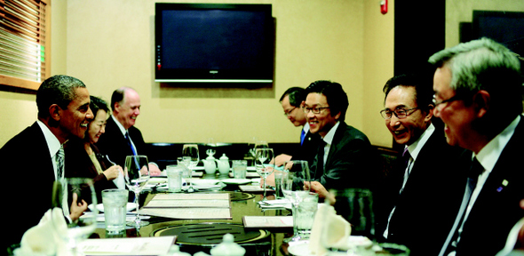 미국을 공식 방문한 이명박 대통령과 버락 오바마 미국 대통령이 9월12일(현지시각) 워싱턴 D.C. 버지니아 타이슨스의 한식당 ‘우래옥’에서 웃고 있다. 이날 미국 상원은 한-미 자유무역협정(FTA) 이행 법안을 가결했다. 한겨레 김봉규 기자