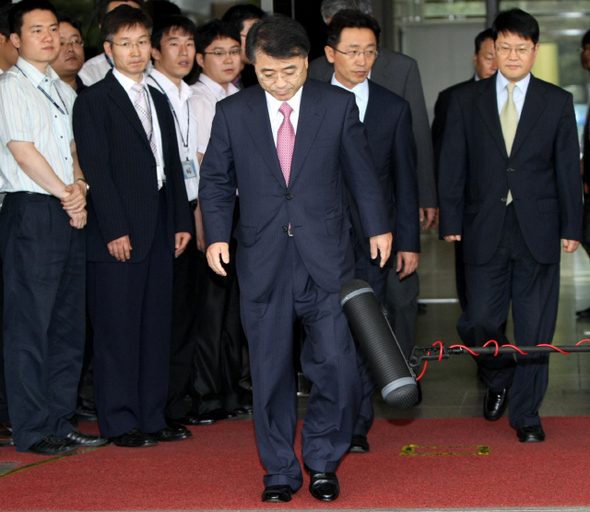 ‘스폰서 검사’로 이름을 날린 천성관 서울중앙지검장이 검찰총장 하루 만인 2009년 7월17일 퇴임식을 하고 청사를 떠나고 있다. <한겨레> 박종식