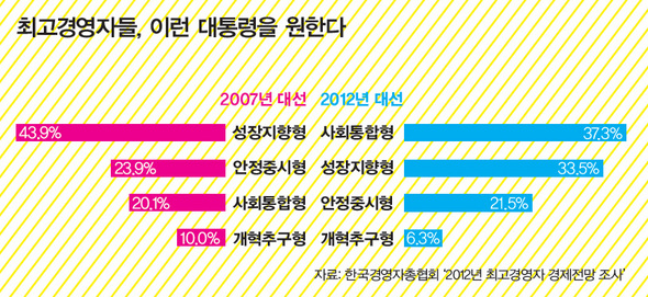 최고경영자들도 다음 대통령이 가장 먼저 할 일로 성장이나 안정보다 사회통합을 들었다. 한국경영자총협회가 242개 기업의 최고경영자를 대상으로 한 설문 결과를 보면, 다음 대통령의 과업으로 사회통합을 꼽은 비율이 37.3%로 가장 높게 나타났다. 2007년 대선을 앞두고 최고경영자 가운데 거의 절반(43.9%)이 ‘성장’을 꼽은 것과 대조적이다.