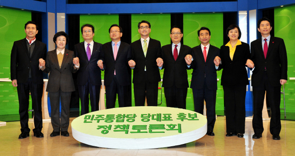 1월6일 오후 서울 양천구 목동 방송회관에서 민주통합당 당 대표 경선에 나선 9명의 후보들이 텔레비전 토론회에 앞서 함께 인사하고 있다. 국회사진기자단