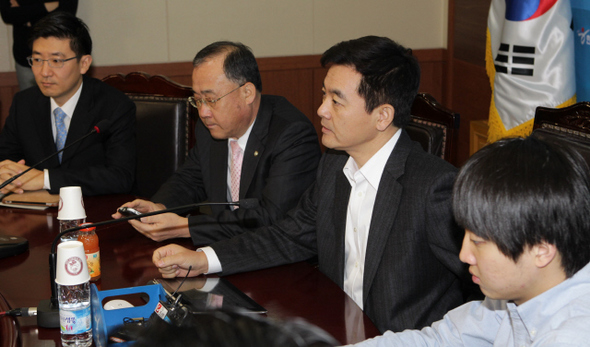 새누리당의 SNS 전략을 총괄하는 눈높이위원회 위원들이 지난 1월25일 서울 여의도 당사에서 토론하고 있다. 조현정 위원장(오른쪽에서 둘째)은 “제갈공명이 와도 분위기 반전은 어렵다”며 SNS 소통의 어려움을 토로한다. <한겨레> 강창광