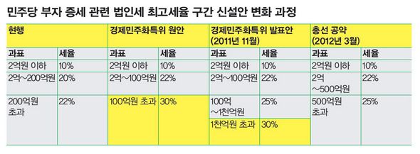 법인세만큼은 아니지만 소득세 최고세율 구간 신설안도 후퇴하기는 마찬가지다. 경제민주화특위는 1억5천만원 초과 과표 구간은 세율을 35%에서 40%로 올리는 방안을 제시했다. 하지만 민주당은 총선 공약에서 최고세율을 38%로 완화했다.