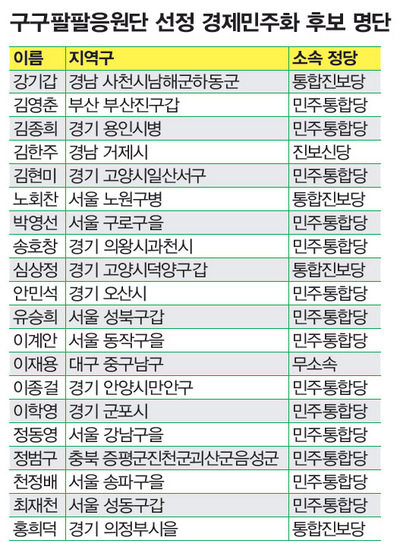 유세단은 지원 대상 후보 20명을 발표했다(표 참조). 유세단은 “재벌 개혁, 보편적 복지, 한-미 자유무역협정(FTA) 반대, 4대강 반대 등 경제민주화 관련 이슈에 대해 일관되게 올바른 태도를 취하고 실천해온 후보들”이라며 “트위터·페이스북 등 소셜네트워크서비스(SNS)를 통해 받은 추천을 바탕으로 유세단의 논의와 검증을 거쳤다”고 밝혔다.