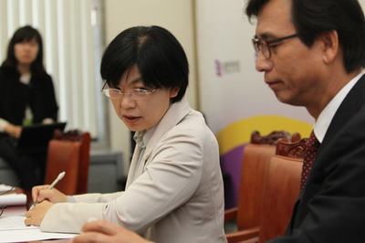 이정희·유시민 통합진보당 공동대표가 5월7일 국회에서 열린 대표단회의에서 굳은  표정으로 앉아 있다. 통합진보당 창당 과정에서 찰떡궁합을 뽐내던 두 사람의 관계는 비례대표 경선 부정 사태 이후 꽁꽁 얼어붙었다. <한겨레> 강창광 기자
