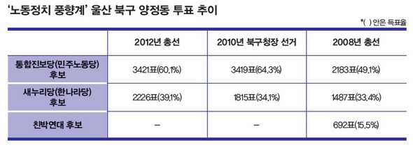 방석수 통합진보당 울산시당 위원장은 “단순한 반MB 연대에 과도하게 기댔다”는 말로 원인 분석을 시작했다. 방 위원장은 그 밖에도 △진보정당으로서 정책 차별화 실패 △대세론에 안주 △통합진보당에 노동자 참여 배제 △후보 선출 과정의 갈등 등을 꼽았다. 방 위원장은 “민노당은 어느 정도 노동중심성이 인정됐는데 통합진보당 통합 과정에서 노동자가 주도적으로 참여하지 못해 ‘진보정당 맞냐’는 의문이 (울산에서) 제기됐다”고 말했다. 노동자들을 제대로 대표하지 못했다는 반성에 무게가 쏠려 있다. [%%IMAGE2%%] 보수는 뭉치고 진보는 지지부진 울산에서 오랫동안 노동운동과 진보정당 운동을 한 이영도(51) 노동인권센터 ‘더불어 숲’ 대표는 통합진보당 울산시당의 패권주의를 먼저 꼽았다. 그는 최근까지 민주노총 울산본부 수석부본부장으로 활동했다. 진보신당 당원이지만 울산 동구에서 통합진보당 후보 선거운동도 했다. 이 대표는 “울산 여론에 영향력이 큰 노동조합 활동가들이 통합진보당과 진보신당의 후보 경선 과정에 실망했다”고 말했다. 통합진보당의 패권주의로 진보신당과의 후보 선출 과정에서 논란이 벌어졌고, 이것이 진보적 유권자들의 실망을 불렀다는 것이다. 울산 북구가 노동정치의 풍향계라면, 북구 안에서는 양정동이 풍향계다. 현대자동차 공장이 거기 있다. 2010년과 2012년 양정동의 투표 추이는 이 대표의 분석과 들어맞는다. 2010년 지방선거 울산 북구청장 선거에서 양정동 유권자 3419명이 민주노동당 윤종오 구청장을 찍었고 1815명이 한나라당 후보를 찍었다. 투표율은 56.6%였다. 울산선거관리위원회의 설명을 종합하면, 지난 4·11 총선 때 김창현 전 위원장은 3421표를 얻었고 새누리당 박대동 의원은 2226표를 얻었다. 2008년엔 양정동에서 한나라당 윤두환 의원이 1487표를 얻었고 민노당 이영희 후보는 2183표를 얻었다. 친박연대 후보는 692표를 얻었다. 2008년 한나라당 득표와 친박연대 득표를 합치면 올해 총선의 새누리당 득표에 육박한다. 진보는 지지부진했고 보수는 뭉쳤다. 이런 ‘양정동 현상’이 울산 전역에서 반복됐다는 것이다. 김 대표는 “올해 같은 선거에서 북구에서 진 것은 (표 차이에 상관없이) 대패했다고 봐야 한다”고 덧붙였다. 분열도 패인으로 꼽힌다. 감정의 골이 생각보다 깊었다. 권진회 진보신당 울산시당 위원장은 “통합진보당은 함께할 수 없는 정당”이라고 말했다. 그는 노동자의 정서를 무시한 채 노무현 정부 집권세력인 국민참여당과 통합한 사실을 지적했다. 창원 성산구의 통합진보당 손석형 후보 득표와 진보신당 김창근 후보의 득표를 합치면, 손 후보가 당선됐을 것이다. 새누리당 강기윤 후보가 49.4%를 얻었고 손석형 후보가 43.8%를 얻었다. 김창근 후보는 투표수의 7.1%를 가져갔다. [%%IMAGE3%%] 부·울·경 통진당, ‘통합의 리더십’ 대표 출마? 이영도 대표는 통합진보당이 분열의 책임을 좀더 져야 한다고 평가했다. “울산 북구에서 김창현 전 위원장이 나온다면 동구는 노옥희 전 새진보통합연대 울산대표가 돼야 한다는 게 활동가들의 정서였다. 그런데도 통합진보당이 방석수 위원장 처인 이은주 전 시의원을 임기 도중 사퇴시키면서까지 경선을 추진했고, 결국 노옥희 전 대표가 경선에서 졌다.” 통합진보당 울산시당이 민주통합당 울산시당과 후보 문제를 협상을 통해 풀었듯, 진보신당과 경선이 아닌 협상을 통해 울산 동구 후보를 정해야 했고, 인지도와 헌신성, 능력 등 모든 점에서 노옥희 전 대표가 출마하는 게 옳았다는 취지다. 통합진보당 울산시당이 이런 ‘순리’를 저버리고 당세만 믿고 패권으로 경선을 밀어붙여 활동가들의 실망을 샀다는 이야기다. 이영도 대표는 통합진보당이 이경훈 전 현대차 정규직 노조 지부장을 예비후보로 선택하는 등 ‘운동의 대의’를 저버린 점도 거론했다. 이경훈 전 지부장은 김진숙 민주노총 부산본부 지도위원의 비정규직 강연을 가로막은 일화로 유명하다. 이상호 민주노총 정책연구원 연구위원도 토론회 발제문을 통해 “울산연합의 오만함이 (선거) 패배를 불렀다”며 “창원은 민주노조운동 내 평등파와 자주파 싸움으로 말아먹었다”고 말했다. 정규직 노조 중심의 조직 노동운동이 조직 노동자도 대표하지 못하고 미조직 노동자도 대표하지 못한 죄. 이영도 대표의 선거 평가다. 국회 토론회에서도 거듭 혁신이 언급됐다. 진보적 학자와 운동가들은, 기왕의 지지 기반(정규직 중심의 민주노총)을 다시 굳건히 하되, 새로운 지지 기반(비정규직 노동자)을 확보하라고 주문했다. 학자들의 주장이 대부분 그렇듯, 답은 명쾌한데 해법은 불투명하다. 통합진보당을 둘러싼 이런 논쟁 때문에 더더욱 6월 말 당 대표 선거에 눈길이 쏠린다. 후보등록일이 6월17일이다. 아직 아무것도 명쾌하지 않다. 경기동부연합과 함께 2006년 이후 민노당의 돈과 자리를 장악해온 광주·전남의 통합진보당 세력이 손잡고 당권파 후보로 오병윤 의원을 밀 것이라는 전망만 유력하다. 비당권파의 여러 세력들은 아직 누구를 내세울지 내부 논의를 하는 수준이다. 이념 지향은 민족해방(NL) 계열이지