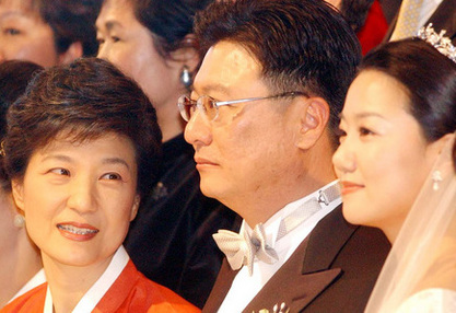 동생 박지만씨와 올케 서향희씨의 2004년 결혼식에 참석한 박근혜 전 새누리당 비상대책위원장. 박 전 위원장은 박정희 전 대통령의 자녀이자 그 자신이 현재 가장 유력한 대선주자다. 사진공동취재단