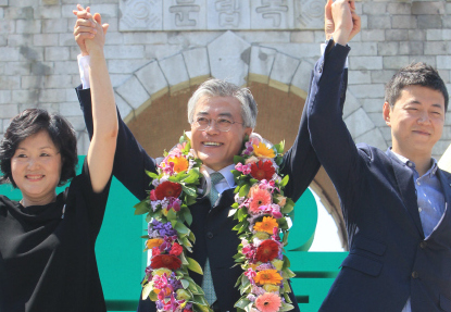 문재인 민주통합당 상임고문과 부인 김정숙씨, 아들 준용씨가 지난 6월17일 서울 서대문 독립공원에서 열린 대선 출마 선언 행사에서 손을 맞잡아 들어 보이고 있다. <한겨레> 이정우 기자