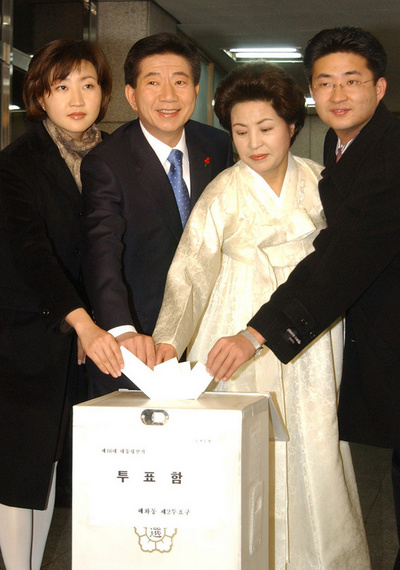 2002년 대선 투표일인 12월19일, 노무현 당시 민주당 후보가 가족들과 함께 서울 종로구의 투표소에서 한 표를 행사하고 있다. 국회사진기자단