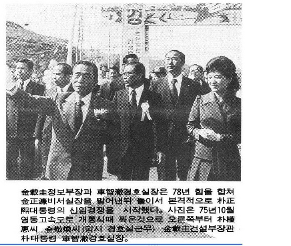1975년 10월 영동고속도로 개통식 때 박정희 대통령 일행. 왼쪽부터 차지철(경호실장), 박정희, 김재규(건설부장관), 전경환(경호실 근무·전두환 전 대통령의 동생), 박근혜. 김재규는 1974년 9월 건설부장관 취임식 때 권총을 품고 가는 등 ‘10·26’ 이전부터 여러 차례 ‘박정희 제거’를 모의했다고 진술했다.  <한겨레> 자료사진