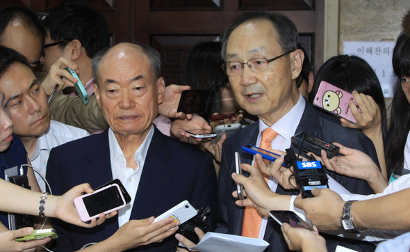 백낙청 서울대 명예교수(오른쪽)와 박재승 전 대한변협 회장 등 ‘희망2013 승리2012 원탁회의‘에 참가한 시민사회 원로들이 23일 오전 국회에서 안철수 서울대 융합과학기술대학원장의 대통령선거 출마에 대한 결단을 촉구하는 기자회견을 한 뒤 회견장을 나서며 기자들의 질문에 답하고 있다. 이정우 선임기자