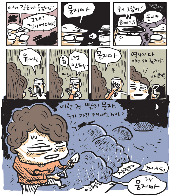 페이스북 0트위터 0공유네이버블로그카카오스토리카카오톡 공유하기스크랩프린트크게 작게 클릭하시면 더 큰 크기의 만화를 보실 수 있습니다. 한겨레와 함께 걸어주세요섬세하게 세상을 보고 용기있게 기사를 쓰겠습니다.후원하기후원제 소개좋은 언론을 향한 동행,한겨레를 후원해 주세요한겨레는 독자의 신뢰를 바탕으로 취재하고 보도합니다.후원하기후원제 소개당신의 가치를 후원으로 얹어주세요평화를 갈망하는 마음, 평등을 지향하는 마음,환경을 염려하는 마음...후원하기후원제 소개����시사만화해피엔딩삽질의 추억훈장도 셀프?한겨레21 인기기사제 1587호20251031차례보기지난호보기낱권구입구독신청한겨레 인기기사