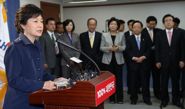 박근혜 새누리당 대선 후보는 ‘쇄신’과 ‘통합’이라는 두 마리 토끼를 모두 잡을 수 있을까. 그에게 주어진 시간은 많지 않다. 박 후보가 지난 10월11일 오전 서울 여의도 새누리당사에서 중앙선대위 인선 결과를 발표하고 있다. 한겨레 강창광