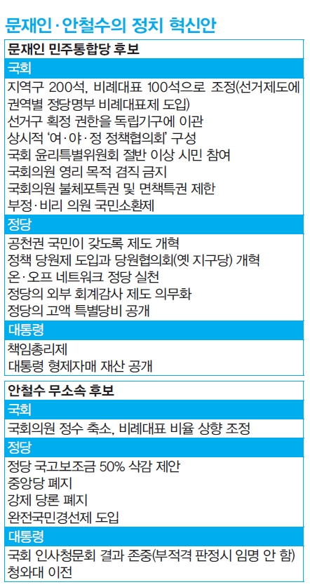 평가는 냉혹했다. 안 후보의 정치 혁신 방안에 대한 비판의 요체는 ‘대의제 민주주의에 대한 몰이해’라는 측면이다. 박상훈 후마니타스 대표(정치학 박사)는 “정치의 기능은 사회적 갈등을 민주적이고 비폭력적인 방식으로 표출·조정·해결하는 것”이라며 “안 후보는 그 정치의 과정을 불편해한다는 점에서 ‘탈여의도’를 선언했던 이명박 대통령과 비슷한 부분이 있다”고 지적했다.