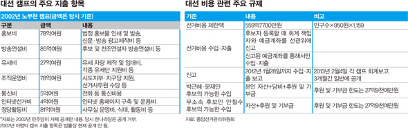 2002년 민주당이 자체적으로 밝힌 노무현 캠프 지출 항목을 보면 올 대선 캠프의 지출 항목도 가늠할 수 있다. 당시 한나라당은 이회창 캠프 지출 항목을 공개하지 않았다. 2007년 이명박 캠프의 구체적 선거비용 정치자금 항목은 법률상 지금은 볼 수 없다. 대선 캠프 회계정보는 선거 이후 석 달간 일반인에 공개되고 열람도 가능하지만, 그 기간이 끝나면 정치자금법상 볼 수 없다. 오직 총수입과 총지출만 공개된다. 당시 노무현 캠프의 가장 큰 지출 항목은 ‘방송연설비(85억여원)-정당활동비(81억여원)-홍보비(78억여원)와 조직운영비(78억여원)-유세비(27억여원)’ 순이었다.