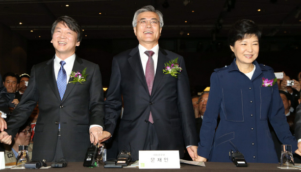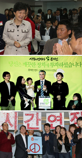 무소속 후보와 정당 후보는 선거비용 수입 항목에서 큰 차이가 있다. 박근혜, 문재인 후보와 달리 무소속 안철수 후보(왼쪽부터)는 정당보조금을 선거비용으로 활용할 수 없다. 다른 두 후보에 비해 안 후보 캠프가 좀더 쪼들리는 이유다. 사진 신소영 기자, 강창광 기자, 이정우 기자