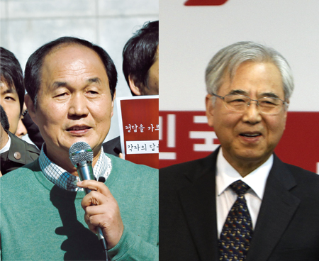 ‘2012 민주·진보 진영 서울교육감 추대위원회’를 통해 단일후보로 뽑힌 이수호 전 전국교직원노조 위원장(왼쪽)과 보수 진영의 ‘좋은교육감추대시민회의’ 등을 통해 단일후보로 나선 문용린 서울대 명예교수. 한겨레 류우종 기자, 한겨레 김경호 기자