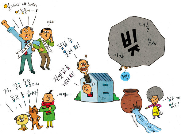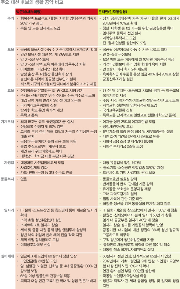 | | 한 가족이 예비 대통령감을 두고 논쟁에 열심입니다. 아버지가 “호남·친노 정당은 안 된다”며 ‘정당론’을 설파합니다. 옆에서 어머니가 “여성 대통령도 한 번쯤 나와야 한다”며 ‘인물론’으로 거듭니다. 발끈한 큰딸은 “보수 세력 때문에 삶이 팍팍해졌다”며 ‘정권심판론’을 외치고, 선거에 도통 관심이 없는 남동생은 슬그머니 자리를 떠버립니다. 얼마 전 정년퇴직한 뒤 집에 들어앉은 아버지도, 졸지에 가장이 된 비정규직 어머니도, 신혼집 구하느라 애먹는 큰딸도, 취업 준비만 수년째인 남동생도 정작 자신이 지지하거나 반대하는 후보자가 약속하는 자신들의 미래에는 별 관심이 없어 보입니다. 대부분의 유권자가 지금껏 이렇게 대통령을 선택해왔습니다. 선거를 10여 일 앞둔 시점에 새삼스레 정책선거를 하는 합리적 유권자가 되자는 주장을 하려는 건 아닙니다. 다만 앞으로 5년간 내 삶을 맡길 대통령이라면 적어도 나의 고민에 공감하고, 나를 도와줄 준비가 됐는지 따져보고 뽑자는 겁니다. ‘나의 가장 큰 고민과 관련해 대선 후보자에게 궁금한 것이 무엇이냐’고 독자, 지인, 소셜네트워크서비스(SNS) 사용자들에게 물었습니다. 국가 안보, 국익, 한국 경제 따위의 거창한 질문은 정중하게 사양했습니다. 나의 삶과 밀접한 ‘생활 공약’에 대한 질문만 추렸습니다. 그리고 그 고민 해결에 가장 적극적인 후보자가 누구인지, 그들이 약속한 정책을 통해 최대한 분석해봤습니다. 아직 후보자를 선택 못했거나 투표하지 않으려는 독자들이 최종 결정을 하는 데 작은 도움이라도 됐으면 합니다. _편집자 |
