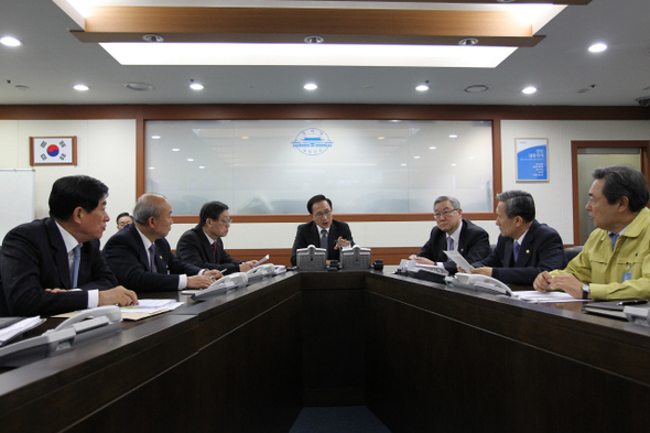 북한이 전격적으로 로켓을 발사한 12월12일 오전, 이명박 대통령이 청와대 국가위기관리실에서 국가안전보장회의를 주재하고 있다. 대통령은 물론 회의 참석자들의 표정이 아주 어둡다. 사태의 심각성 때문일까, 정보 판단 실패로‘안보 무능’이 만천하에 드러난 게 민망해서일까. 청와대사진기자단