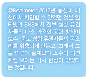 18대 대선 득표 결과를 놓고 설왕설래하 지만, 전략 실패로 보수층 결집을 초래해서 문재인 후보가 패배했다는 것을 부정하기 어렵다. 당연히 전략의 문제를 논하는 것도 중요하겠지만, 여기에서 주목하고 싶은 것은 보수층 결집이라는 현상이다.