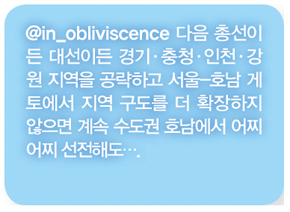 서울과 지방 사이에 격차가 커질수록 서 울의 이슈가 지방의 관심사와 분리되는 현 상이 가속화해왔다는 현실이 중요하다. 이 른바 ‘서울 게토화’가 일어났던 셈이다. 그러 나 이렇게 서울을 고립시키며 자신들의 이해 관계를 위해 지방의 보수층은 결집했지만, 실상 그 뭉친 세력의 안을 들여다보면 지방 이라는 서로 다른 이질성들로 꽉 차 있음을 잊지 말아야겠다. 그 이질성을 비집고 들어 가는 것이 정치의 역할이다.