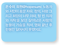 물론 이 역시 무리한 상상이다. 기성세대 라고 해서 자신이 살아낸 한국 현대사의 단 면을 속속들이 파악하고 있지는 않다. 가장 높은 가능성은 그들이 영화 속에서 펼쳐내 는 사건들을 한국 사회와 연결짓지 못하리 란 것이다. 영화 <아바타>를 보는 이들이 철 거민 투쟁이나 용산 참사를 떠올리지는 못 할 것처럼. 다만 영화의 내용을 정치적으로 전유하는 것이 ‘문재인을 지지한 이들’에게만 가능한 일이 아니란 건 분명하다.