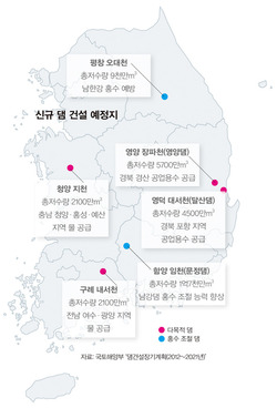 [%%IMAGE5%%]18대 대통령 선거일을 이틀 앞둔 지난해 12월17일 국토해양부는 중앙하천관리위원회를 열어 6곳의 댐 건설 예정지가 고시된 ‘댐건설장기계획(2012~2021년)’을 심의 확정했다. 예정지 6곳에는 주민과 환경단체의 반발로 진통을 겪고 있는 경북 영양의 장파천(영양댐)과 영덕의 대서천(달산댐), 경남 함양의 임천(문정댐·일명 지리산댐)이 포함됐다. 대서천과 장파천은 각각 댐 건설을 위한 타당성조사와 예비타당성조사를 마친 상태며, 임천은 현재 예비타당성조사가 진행 중이다. 나머지 3곳은 전남 구례 내서천과 강원 평창 오대천, 충남 청양 지천이다. 세종시 출범 등을 이유로 최근 일부 정치인들이 용수댐 건설 여론을 지피고 있는 청양 지천과 달리, 내서천과 오대천은 지금까지 댐 후보지로 한번도 오르내린 적이 없는 지역이다.