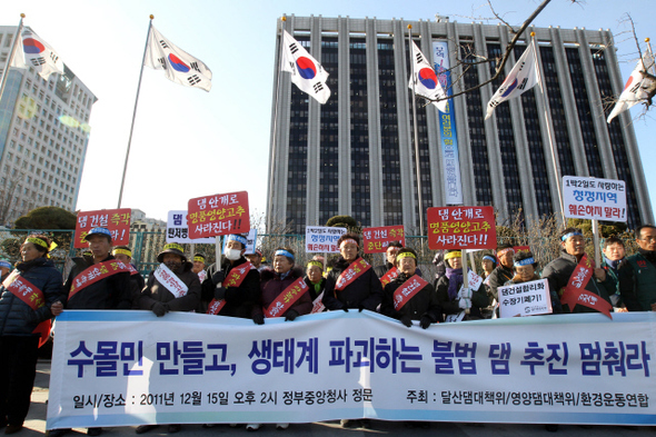 2011년 12월 경북 영양과 영덕에서 상경한 주민들이 서울 세종로 정부중앙청사 앞에서 국토해양부의 영양·달산댐 건설 계획 철회를 요구하는 기자회견을 열고 있다. 김태형 기자
